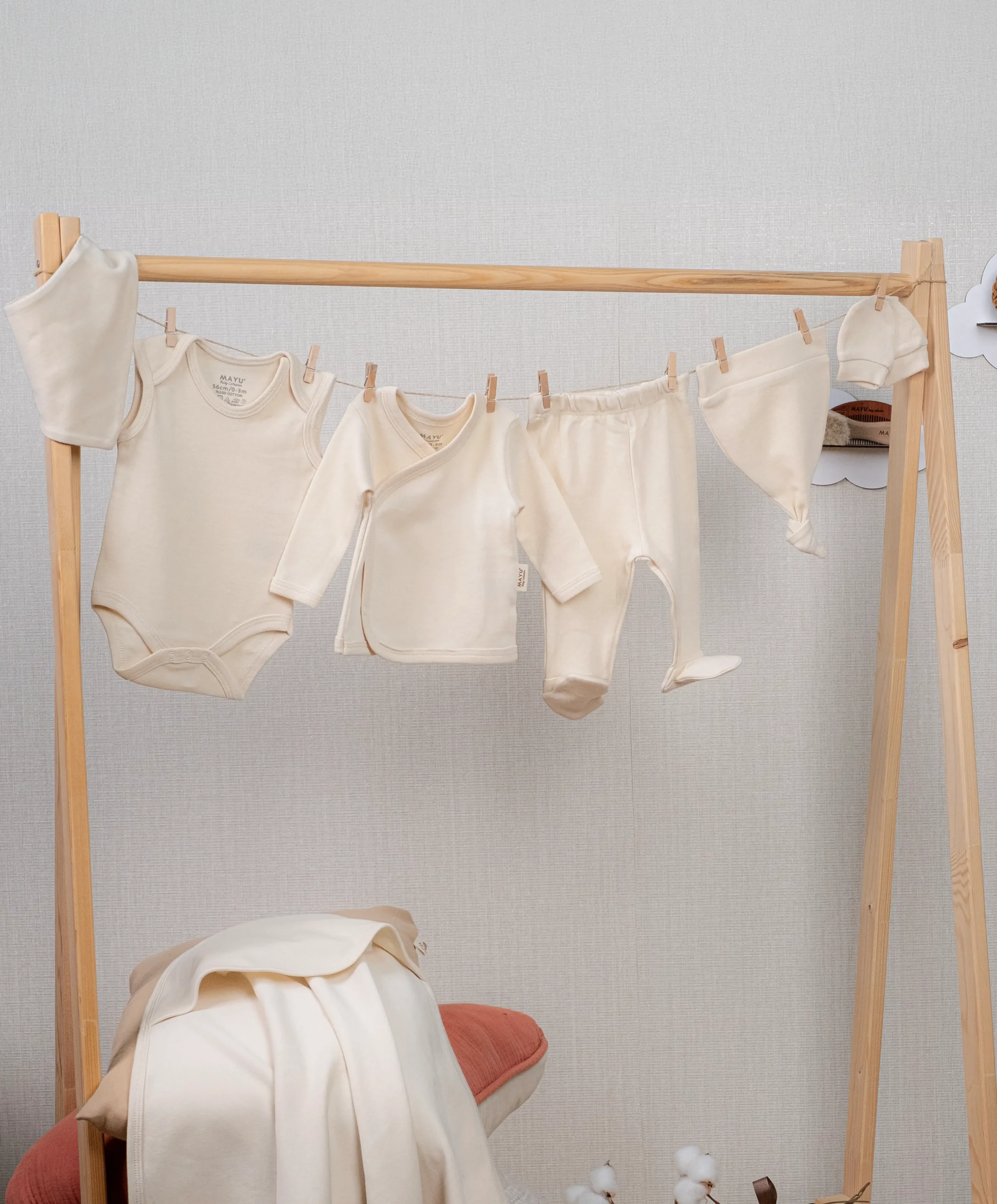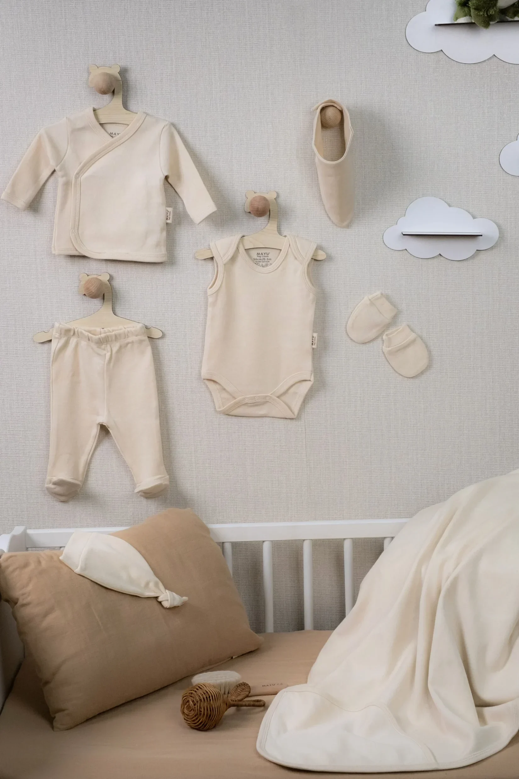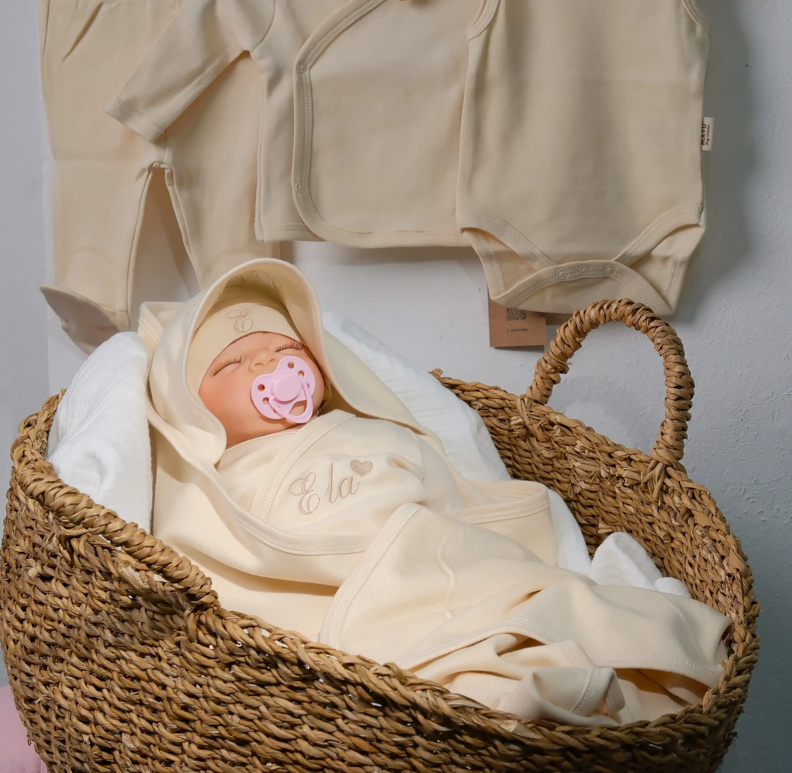 - Organik yeni doğan hastane çıkış setimiz tamamen organik, boya işlemi görmemiş ham pamuktan üretilmiştir.